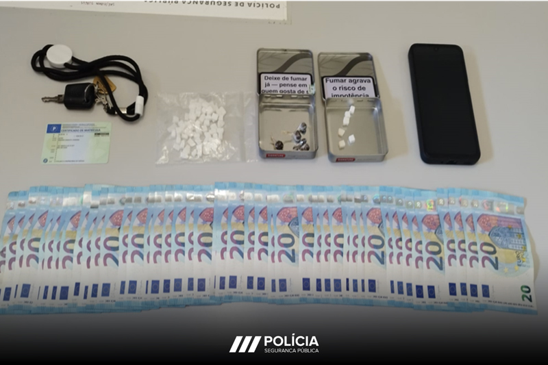 Segundo esta fonte policial, “no momento da detenção, o suspeito encontrava-se na posse de cerca de 98 doses individuais de produto estupefaciente (cocaína e haxixe), as quais foram apreendidas”. Para além disso, diz a PSP, “foi, igualmente apreendido numerário em notas do Banco Central Europeu e uma viatura ligeira de passageiros, por haver fortes indícios de constituir produto e/ou instrumento de atividade ilícita”.